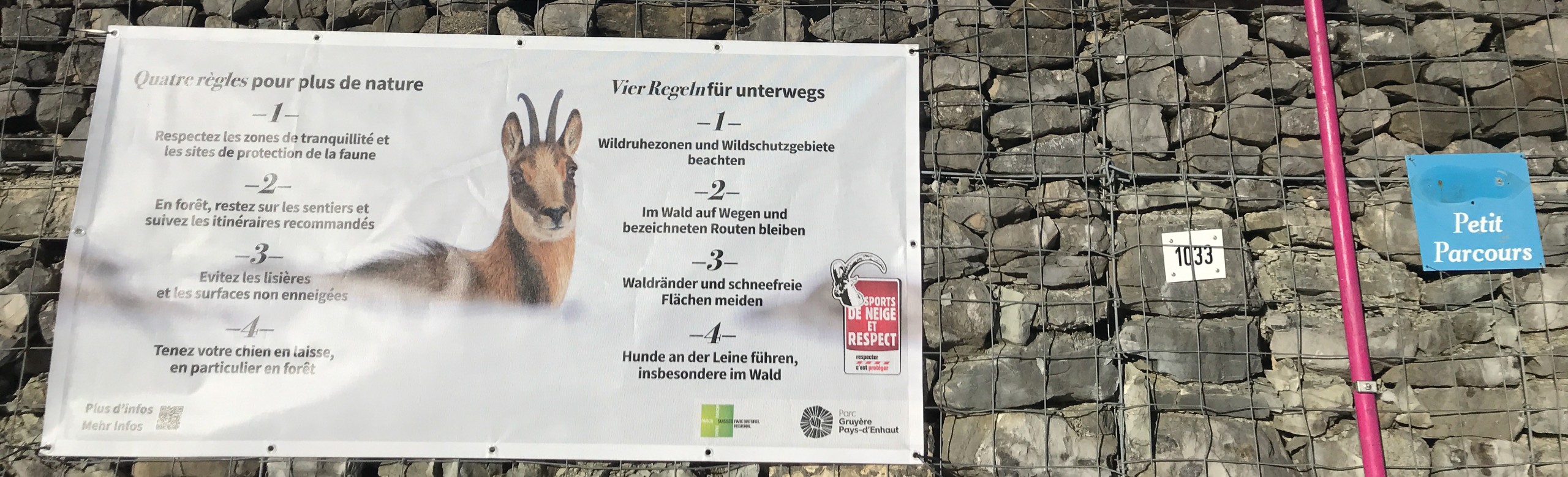 En hiver, la faune sauvage est particulièrement fragile et sensible au dérangement. Afin de minimiser les impacts des loisirs en plein air, il est important d’adopter les bons comportements lors des randonnées hivernales, en raquette ou à ski. Afin de sensibiliser les randonneurs, une douzaine de bâches ont été posées sur le territoire du Parc. Les endroits ont été définis de manière stratégique en collaboration avec les surveillants de la faune. Elles se trouvent notamment au départ des sentiers balisés de raquette, ou encore, de départ de randonnées à ski populaires comme le Pic Chaussy au départ des Mosses.
